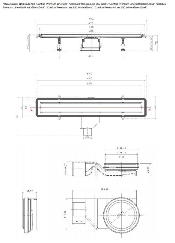 Душевой трап Pestan Confluo Premium Black Glass Line GOLD 650