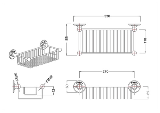Устройство имеет прямоугольную форму и характеризуется достаточной глубиной - 62м. Для того чтобы использовать приспособление по своему прямому назначению, его монтируют прямо на стене ванной комнаты. Мыло для принятия гигиенических процедур всегда будет под рукой. Для выполнения проволочной корзинки использована хромированная латунь. Этот материал не позволяет влаге разрушать аксессуар, поэтому мыльница может применяться долгое время.