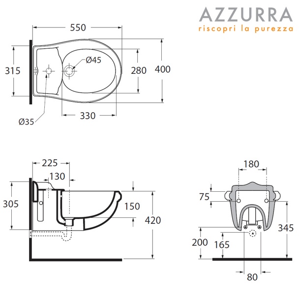 AZZURRA JUBILAEUM биде подвесное с 1 отв под смеситель, с креплением KIT2000CF