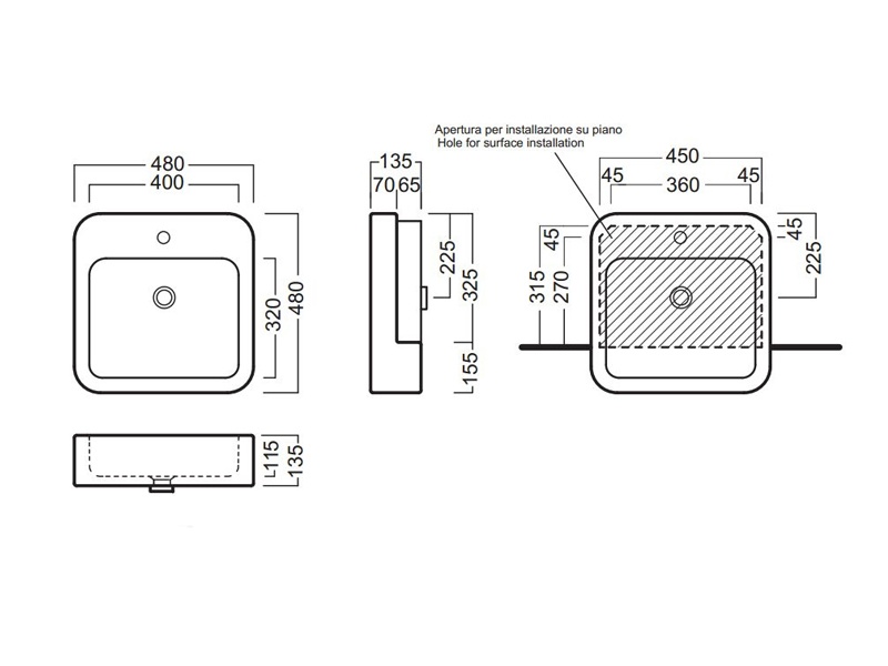 Раковина с одним центральным отверстием под смеситель; с переливом.
