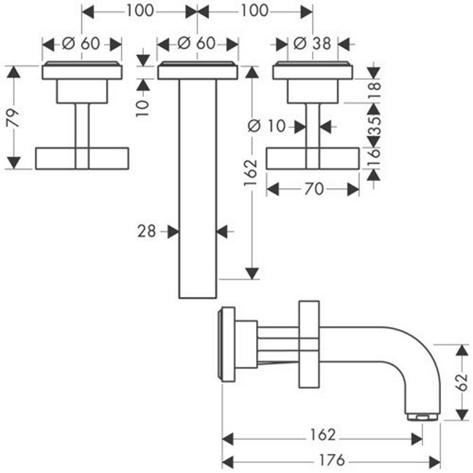 Axor Citterio Встраиваемый смеситель для раковины, на 3 отв, с розетками, излив 162мм, с незапираемым донным клапаном (внешняя часть)