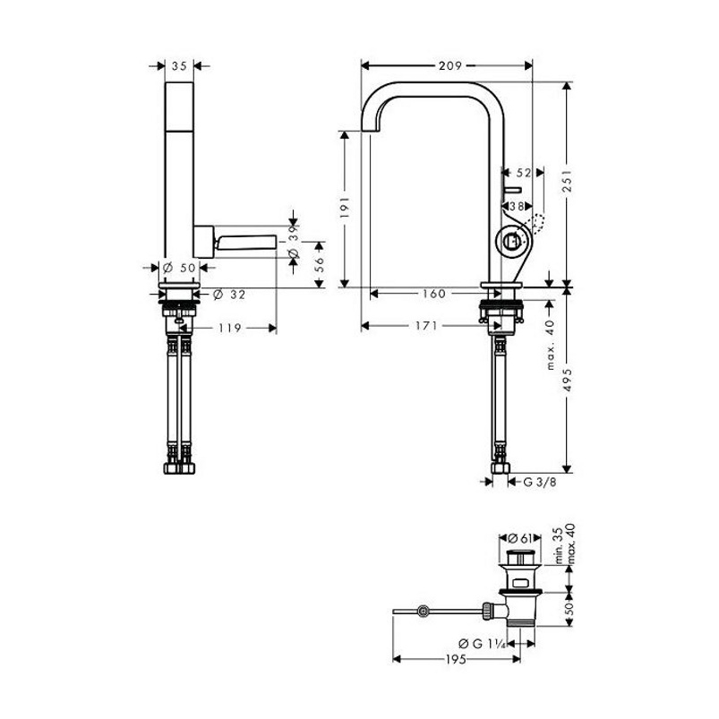 Axor Citterio Смеситель для раковины 190, на 1 отв., излив 160мм, с донным клапаном
