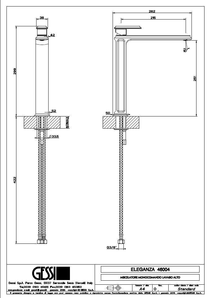 46004#031 Gessi Eleganza Смеситель для раковины на 1 отверстие, высокий, без донного клапана, цвет: хро