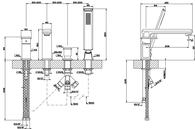 Gessi Eleganza Смеситель для ванны на 4 отверстия, с переключателем, изливом и ручным душем