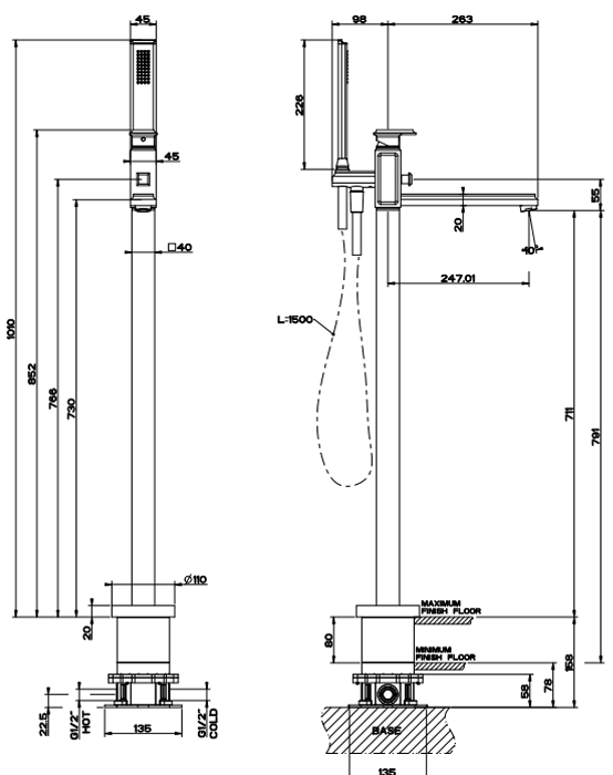 46129#031 Gessi Eleganza Напольный смеситель для ванны с ручным душем (без встраиваемой части), цвет: хром