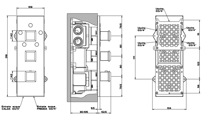 Gessi Eleganza Встраиваемый термостатический смеситель, подключение на 3/4”, с 5-ю выходами и селектором