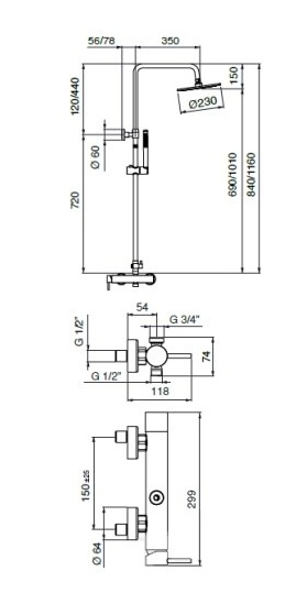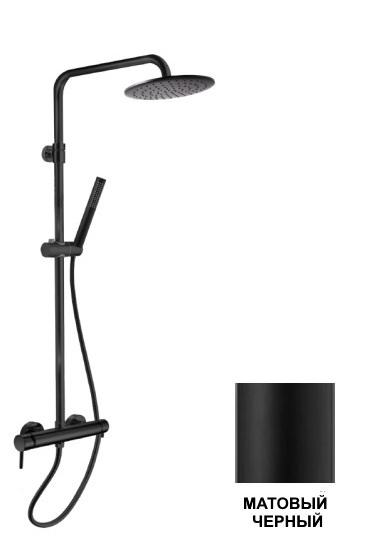 В комплекте: душевая стойка, однорычажный смеситель, душевая лейка O 230 мм, переключатель, ручная лейка и шланг для душа 1,5 м.