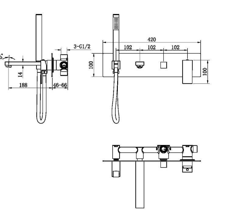 Смеситель для ванны встраиваемый с душ набором Boheme Qubic Matt Gun Metal