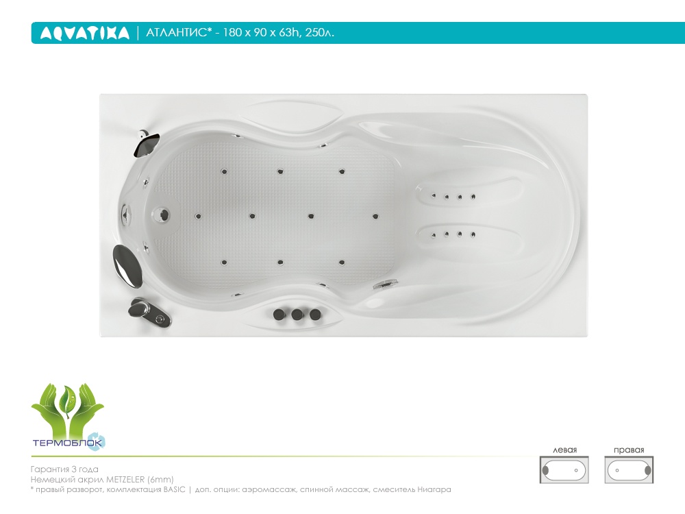 Может ли обычная ванна стать произведением искусства и демонстрацией последних технических достижений одновременно? Конечно, если это ванна «Атлантис», вмещающая 250 л воды. Эргономичность и воплощение оригинальных технических решений позволяют отнести эту модель к классу «люкс», гарантирующему повышенную степень комфорта. Акриловые ванны, оборудованные подающими воду форсунками, дают возможность в домашних условиях ощутить расслабляющий эффект гидромассажа. Ванна быстро заполняется водой, ниспадающей в виде водопада из бортовых отверстий. Внутренняя поверхность изделия, по форме напоминающая восьмерку, максимально удобна для принятия водных процедур лежа или сидя. Дно с ребристой поверхностью предотвращает скольжение, а два подлокотника по бокам обеспечивают дополнительное удобство при использовании ванны «Атлантис».