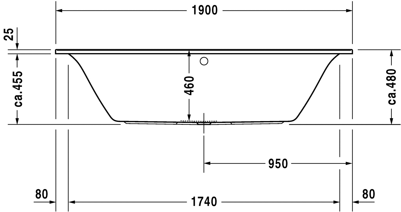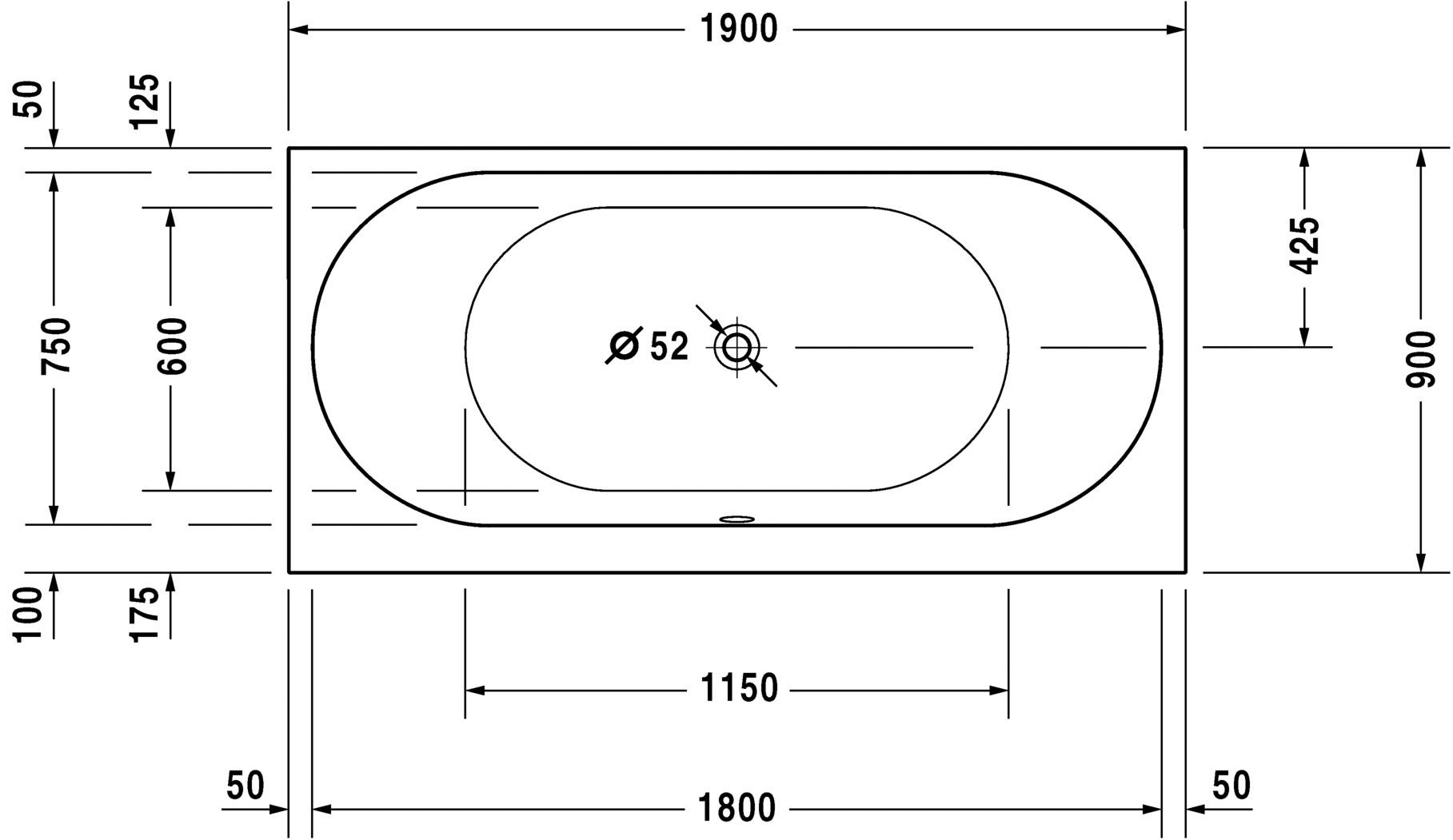 ванна встраиваемая или под внешние панели, слив по центру, 5 мм санитарный акрил