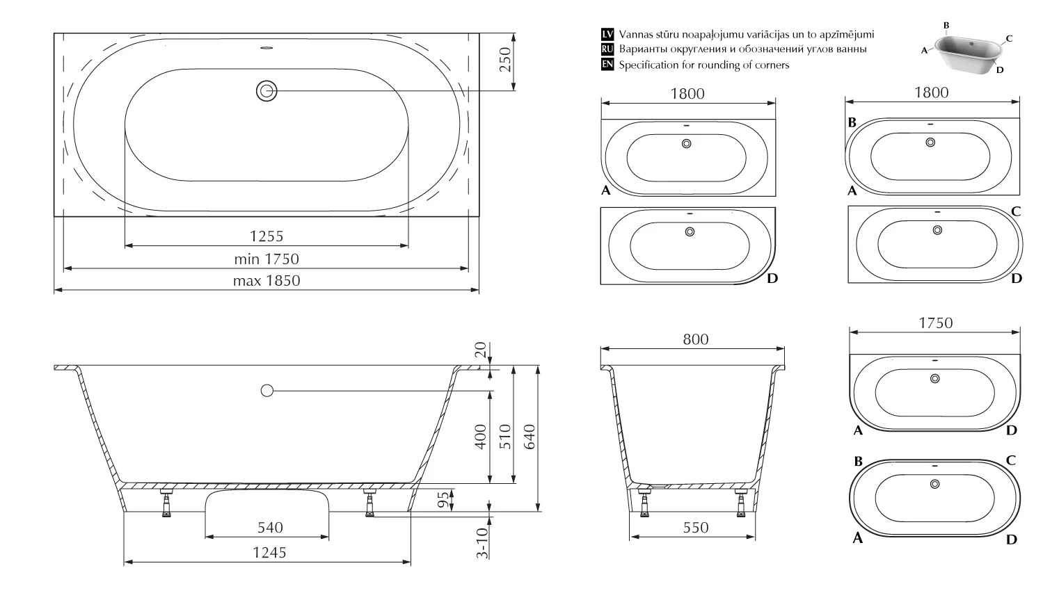 | ** При выборе ванны со слив-переливом хром/пластик минимальная длина ванны 1750 мм |