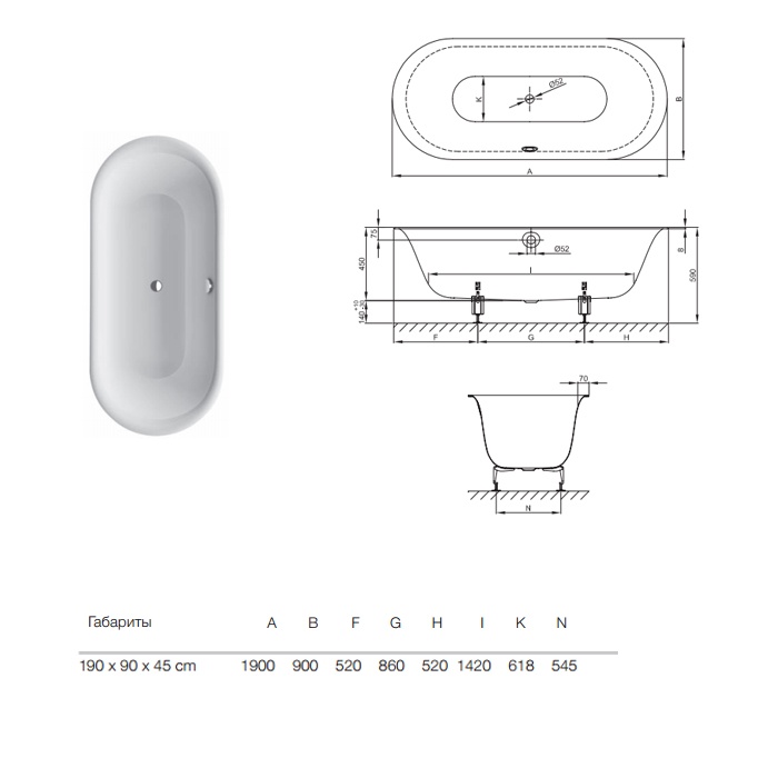 Bette Lux Oval Ванна встраиваемая 190х90х45см с покрытием Glaze Plus, белая
