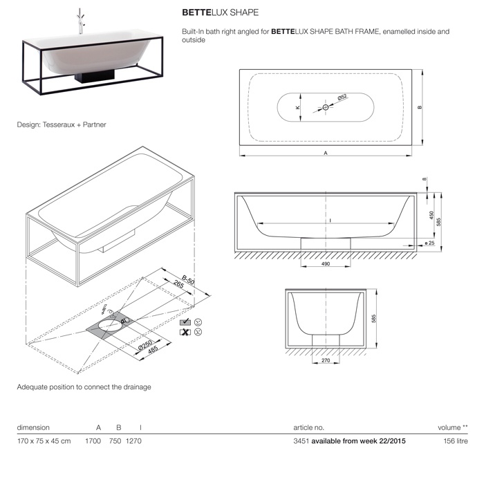 - BetteLux SHAPE Ванна 170x75x45 см покрыта эмалью снаружи и изнутри, покрытием BetteGlasur ® Plus, белая