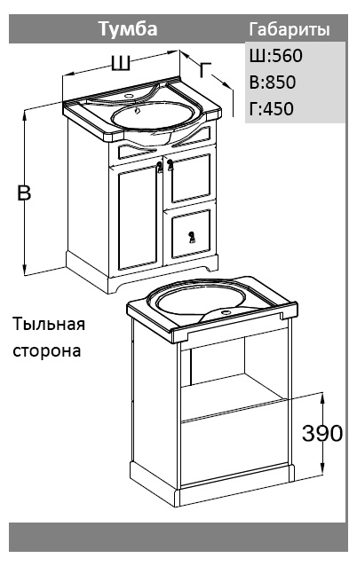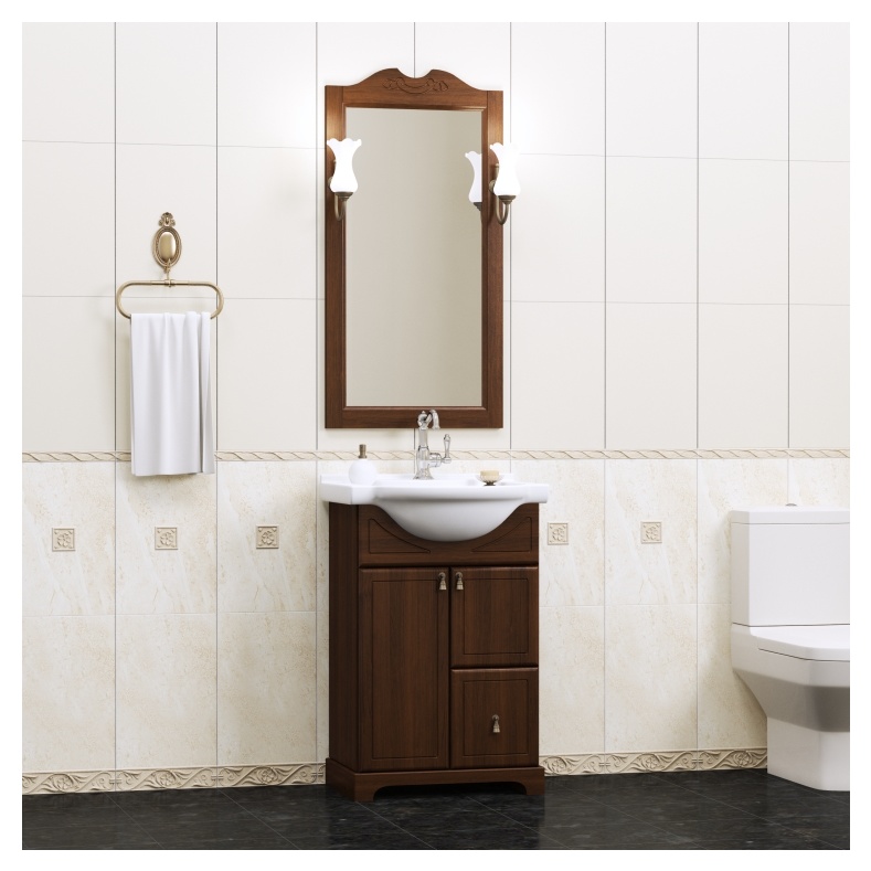 защищенная от воздействия влаги, эта модель изумительно впишется в интерьер.Комплект состоит из зеркала в деревянной раме с двумя изящными светильниками, тумбы с открывным фасадом, выдвижным ящиком и керамической раковины