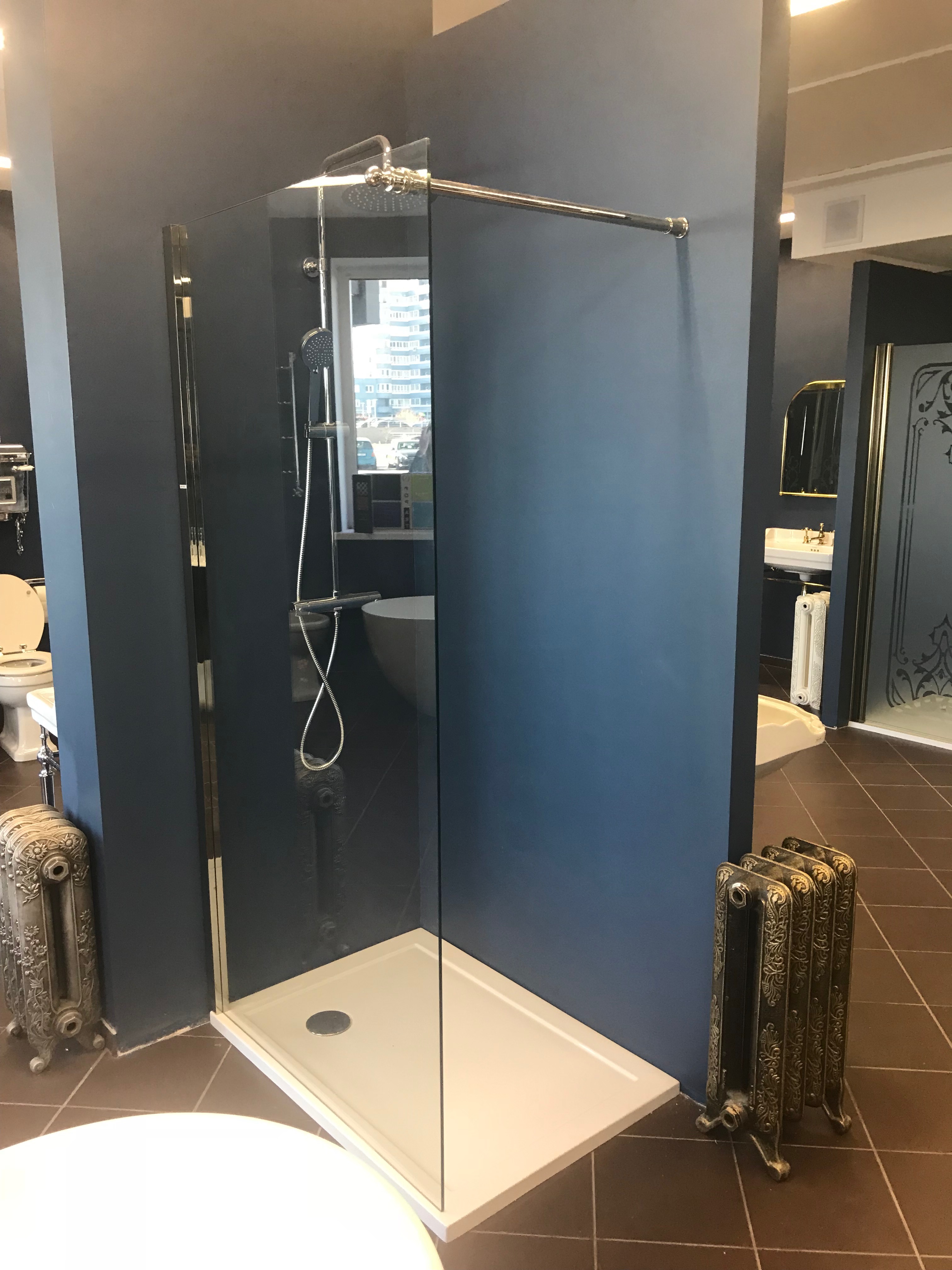 На все неподвижные панели устанавливается стекло толщиной 8мм с защитным покрытием 3М, облегчающим чистку стекла от известкового налёта.